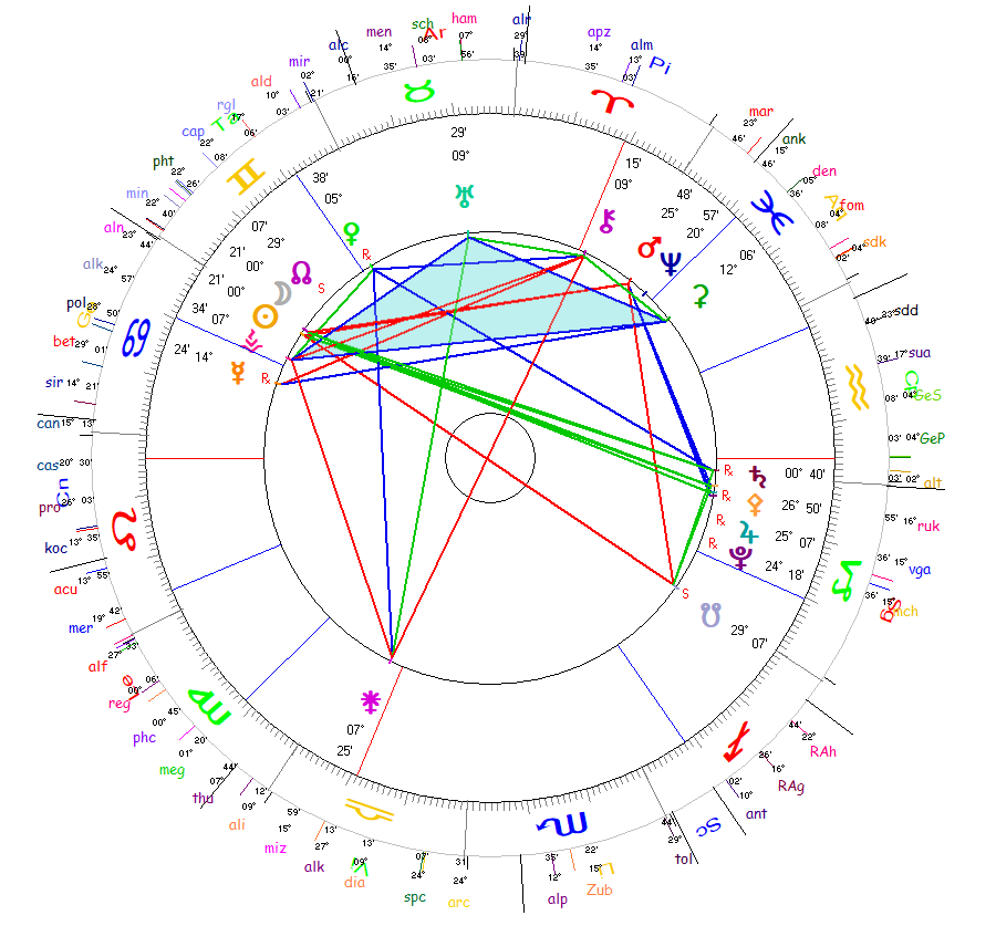 A Sensitivity Triangle has retrogrades Pluto, Jupiter, Pallas Athene and Saturn in (150°) quincunx to the Sun, Moon and North Node and (30°) semi-sextile to the South Node in Sagittarius.