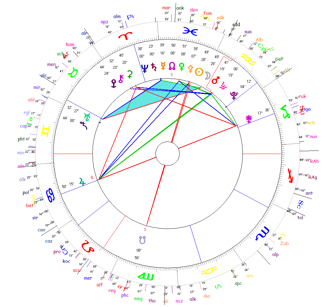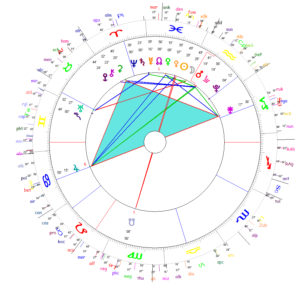 The other major pattern in the Eclipse chart, is the large red T-square, with Ceres conjunct Chiron and Eris in Aries, at the apex of the triangle. These are making squares to retrograde Jupiter in Cancer and to Juno in Capricorn, which are in opposition to one another.